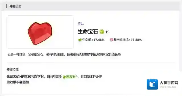 第7件神器为大家推荐就是生命宝石,生命宝石目前带来的生命值提升效果还是比较不错的,并且它本身带有一定的暴击抵抗加成,如果是装备本身属性就不错的话,那么这个角色本身的血量在低于30%的时候,还可以给自己带来一定的恢复能力,不过恢复是只有在神器触发时间之内才可以使用的。