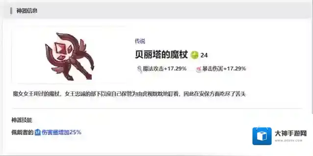 第8个神器为大家推荐贝丽塔的魔杖,这个魔杖神器具备一定的攻击力提升效果,不过这个攻击力提升只能触发在魔法类的攻击上面,如果是爆发伤害的话,那么此时带来的加成数值也是可以根据魔法伤害量来计算,带来的是角色一定百分比的数值。