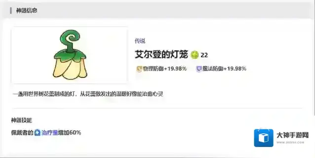 第十个神器为大家推荐艾尔登的灯笼,这个神器目前也是比较适合前排使用,因为它在物理防御上面会有较强的加成,在魔法防御上面的话加成也是有的,但是没有物理防御那么强,效果上面一般可以给穿戴者带来一定治疗量回复的效果,所以它本身带有一定防御之后还可以带来回血,目前可以搭配的前排是比较多的。