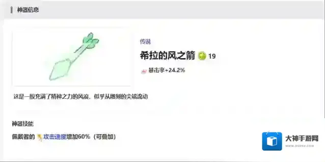第5个神器叫做希拉的风之箭,这个神器更适合一些风属性的角色使用,装备这个神器带来的暴击属性加成是非常不错的,因为这里还有60%的攻速加成效果,所以叠加起来的话,大家走暴击流是非常适合的。