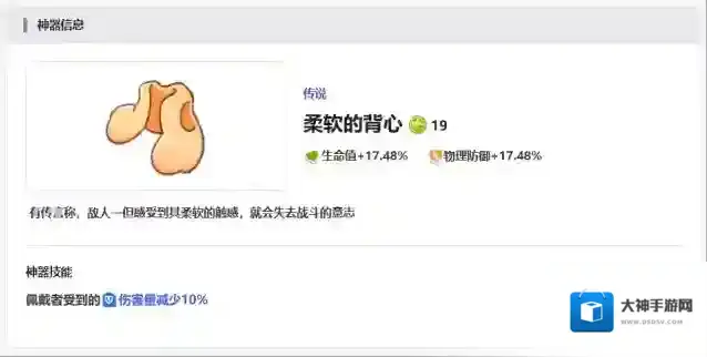 第6件神器为大家推荐柔软的背心,这个神器本身是适合给一些辅助类角色使用的,因为它主要的加成是放在生命值以及物理防御属性加成上面的,所以在技能上面使用的话,可以减少对面受到的伤害数值,也是会有很强的抵御效果。