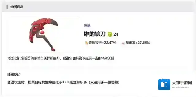 第9个神器为大家推荐的是琳的镰刀,这个神器是给物理系角色使用会比较好,因为带来的物理攻击力提升效果比较强,而在暴击率加成上面,也是比较适合物理流派使用的,而在使用这个神器拥有的普攻攻击,也是会带有一定额外的效果,这一点体现在斩杀的能力上面,如果敌方有18%的血量的话,那么此时使用斩杀这个概率触发会比较大。