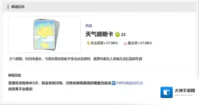 第四个神器叫做天气晴朗卡,带来的攻速以及暴击概率加成比较高,这里大家如果拥有攻击命中3次的效果的话,那么在后面还可以连续发射一个闪电,带来一次最佳攻击的能力。