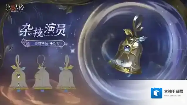 奇珍随身物品杂技演员-手摇铃是一只华丽的铃铛,提手部位像蜿蜒的枝蔓,生生不息,铃铛身上镶嵌着硕大的太阳图案,蓝色宝石在太阳中心绽放着光芒。