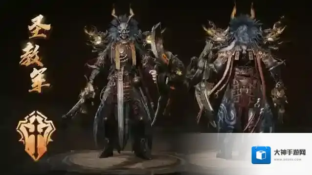 笃信圣光的圣教军,铜钱红线做剑,驱逐诅咒;修罗鬼面为盾,退散妖邪,整套板甲厚重沉稳,符纸木牌坠于其间,颇有钟馗之姿,尽显镇恶的庄严与威仪。