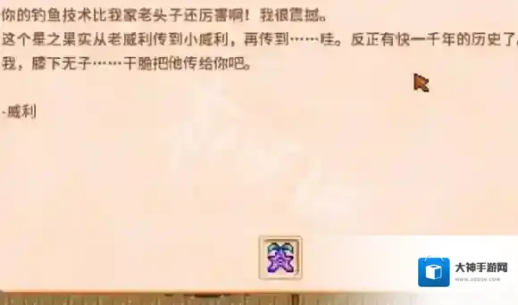 7、钓到除齐先生二代鱼王外所有鱼后,第二天威利会给你写信,夸赞你的钓鱼技术给你他家祖传的星之果实。