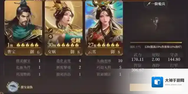 阵容方面,女娲+云霄+曹宝,带枪兵全点智谋。女娲的灵宝和术法都具有群体智谋连击+敌方减伤的效果,担任主将强化队伍的输出能力和生存能力。云霄每次普攻或成功释放主动术法,都有概率额外对目标造成伤害,极大提升队伍输出上限。曹宝主要负责回血回蓝。