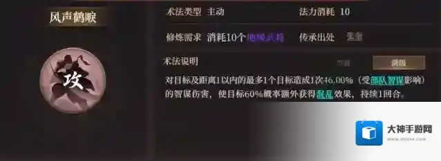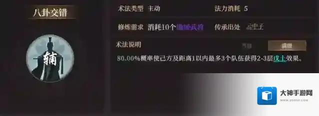 八卦交错,来自云中子。满级80%概率给最多3队上2-3层戊土,也就是8%-12%的减伤,以及8-%12%的持续回血。后期团战盾兵队辅助可带。没敢传道云中子所以不确定强度。