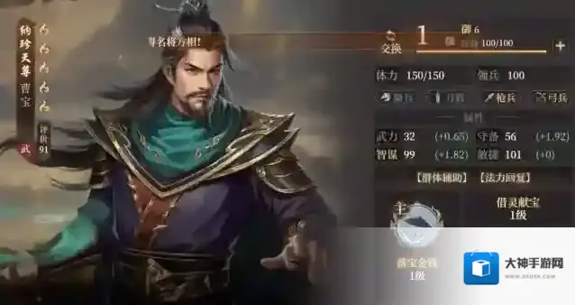 机制独特的群体回蓝辅。自带术法借灵献宝消耗5法力值,满级给最多4个队伍每队回复30点法力。T0级回蓝术法醍醐灌顶只能回复20点,两界通灵概率每回合4点持续5回合。更别说这俩术法都是单体,总回蓝量方面远不如曹宝。