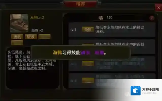 每次升级将按顺序获得对应等级的技能,并将“船盾”的技能效果提高一级。
