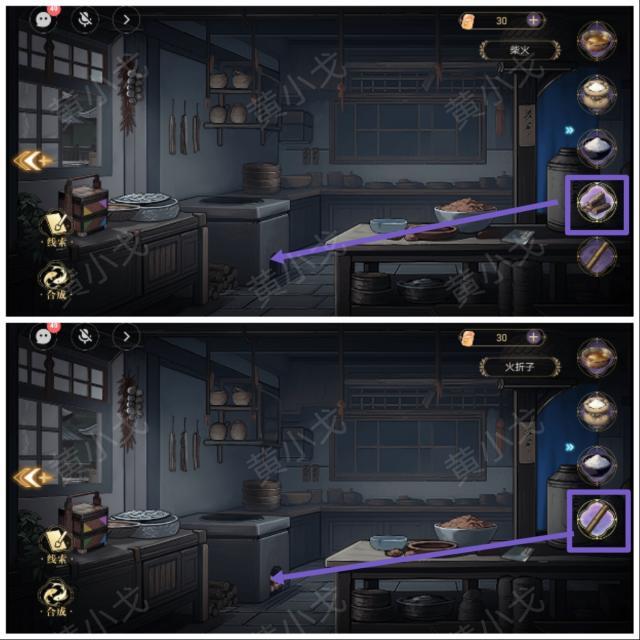 3.先与酒馆老板对话。拾取地上的柴火和桌子上的火折子