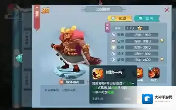 这是单独的一个,之所以推荐是因为它的天赋技能,带嘲讽带眩晕带带灼烧,万金油般的全能小伙伴。牛魔吼啸是控制技,憾地一击可对灼烧目标晕,且冷却回合只有1回合,牛魔王自身还带有被动技灼烧,尤其适合搭配带克制灼烧效果的铁扇公主和红孩儿。