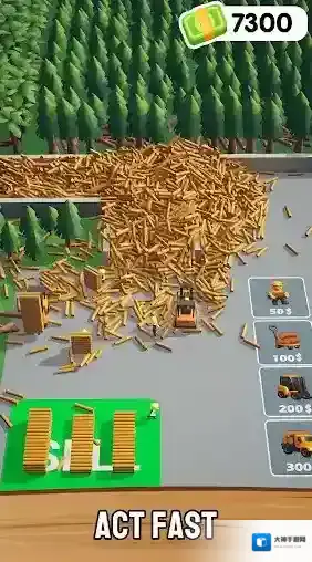 通过加工厂完美的流水线作业,将树木全部变成高品质的木板,为你带来源源不断的财富收入,以此来扩张你的木材厂,研发更多的科技,帮助你成为最棒的木材大亨!除此之外,我们可以通过努力的建设来解锁新的区域,建造起更多的木材厂!