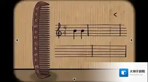 1、梳子视角:点击梳子,根据果实视角纸箱上第二张布胶带图片的提示,用梳子演奏“B→B→D→D→B→B→#G→A→B→D→B→A→#?G→A”,最前面的音符上出现了一把(银钥匙)。