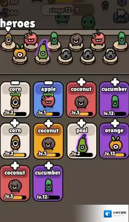 2、点击下方的英雄按钮可以召唤不同的水果,召唤后你可以选择上阵或者用来强化其他水果。