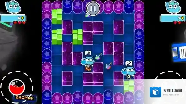 2、进入关卡后玩家滑动左边屏幕可以控制角色移动,角色只会沿着直线前进,右下方是放置水炸弹按钮。