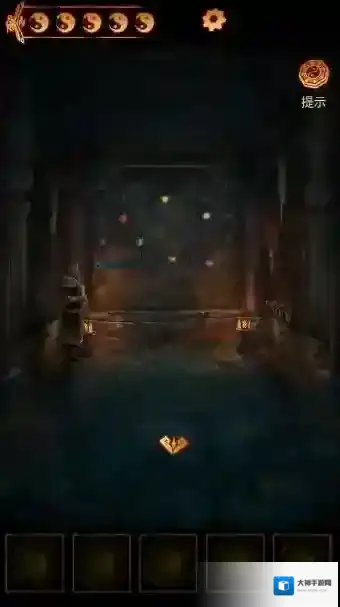 9、桌上获得五个动物灵墓和石印, 将石印放在右边墙面的凹槽处,进入下一个密室。