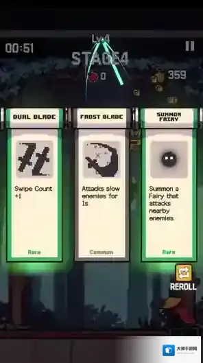 3、当切开水果后玩家会获得经验,经验满后可以升级获得技能,玩家可以选择一个来强化自己。