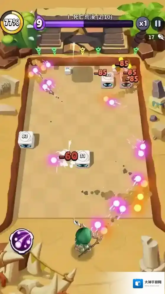 2、进入关卡后滑动屏幕来控制小球的发射角度,角色会自动发射小球进行攻击。