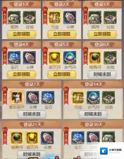 每日登录,根据登录天数领取各式奖励,VIP用户更能得到双倍福利。登陆30天后,即可收获50万宝石、1000令牌和5000万银两的丰盛奖励,助你在江湖中蓄力飞跃!