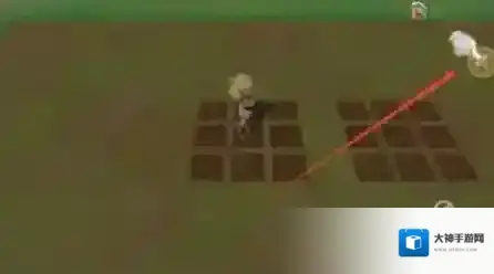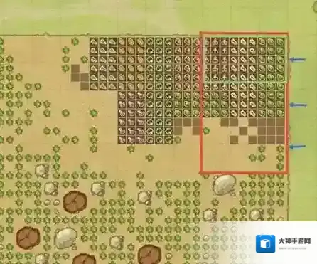 下图红色方框范围即为一个秘银垄,绿色方框为秘银水壶最大蓄力的覆盖范围,在蓝色箭头位置进行三次最大蓄力浇灌即可完全覆盖,秘银垄共135格,秘银水壶容量为300,因此一壶水可以浇灌两个秘银垄。