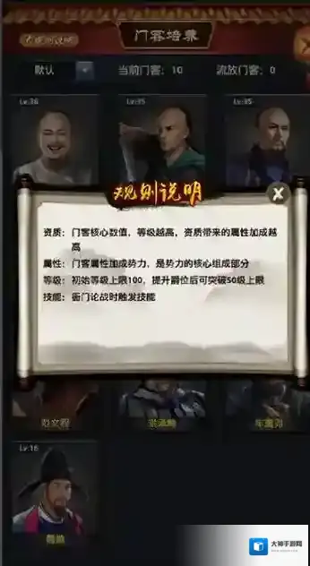 2、每个门客都是拥有自己擅长的领域,并且所有的门客属性都是进行叠加的。拥有的门客数量越多并且等级越高玩家的实力也会越高!