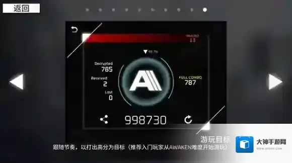 跟随节奏,以打出高分为目标(推荐入门玩家从AWAKEN难度开始游玩)