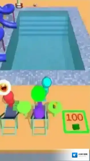 2、呈现泳池及周边休息区场景,有不同颜色火柴人角色(红、蓝、紫等),还有“100”货币标识,玩法是为泳池客人提供服务、收取费用来经营,属于轻松休闲的类型。