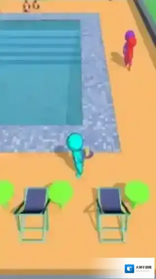 1、呈现泳池场景,有不同颜色的火柴人角色,玩家或需操控角色为泳池区域客人提供服务、完成任务,属于轻松的休闲游戏范畴。