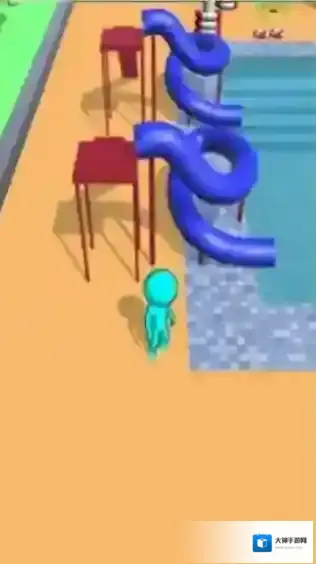 3、呈现水上乐园场景,有蓝色滑梯、火柴人角色,玩家操控角色在水上乐园场景(如通过滑梯、泳池区域)进行闯关、经营或休闲互动,属于轻松趣味的休闲。