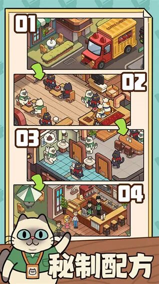A:通过赚取金币可逐步解锁新设备与装饰,升级后能提供更多咖啡甜品类型,吸引更多猫咪顾客光临。