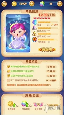 技能2(30级):捡到食材时得分增加50%。