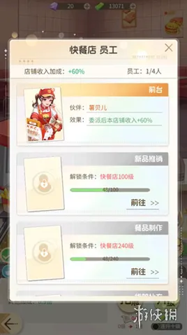 利用+60%的收入加成,可以快速提升营收。随着店铺等级的提升,可以逐步解锁新品推销、餐品制作等岗位,进一步完善员工体系。