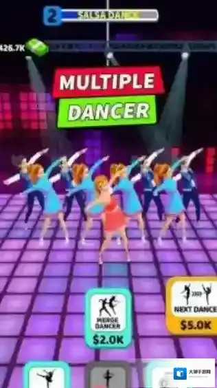 3、“MULTIPLEDANCER”提示,还有“MergeDancer”“NextDance”功能按钮,呈现舞者表演萨尔萨舞的场景,玩家可通过合并舞者、解锁新舞蹈来经营舞蹈团队。