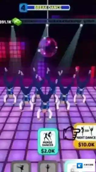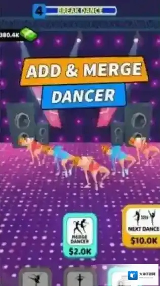 1、有“ADD&MERGEDANCER(添加并合并舞者)”玩法提示,以及“NEWDANCER”“NEXTDANCE”等功能按钮,玩家可通过添加、合并舞者来经营舞蹈团队,开展舞蹈表演。