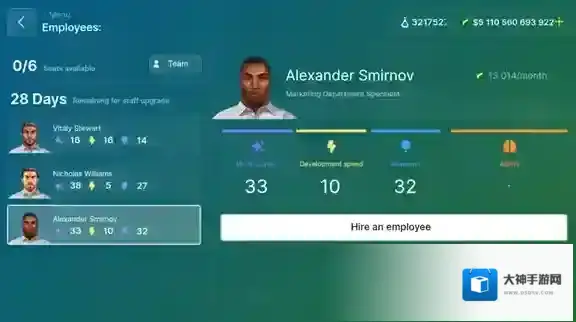 3、不同的员工等你去招募,每位员工都有不同的属性等你去选择。