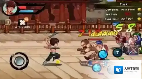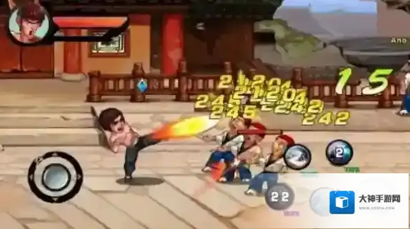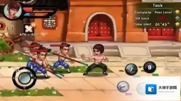 3、画面中有角色在对战,左侧是方向操控按钮,右侧是攻击按钮,右下角攻击按钮旁显示100气角色形象和场景有浓厚的功夫风格。