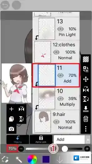 7、由于我们分离的层, 我们也可以改变强度的亮点。 我们可以通过减少①图层不透明度滑块。在这里, 我们已经降低到70%。