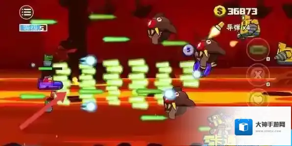 2、关注屏幕显示的【$36873】金币数和【等级5】,使用【导弹x4】等道具消灭怪物,获取金币并提升等级。