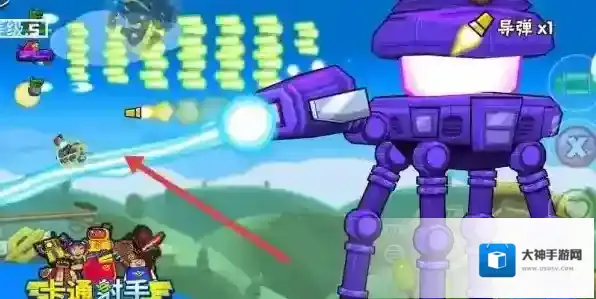 3、新场景中,留意紫色大型机器人敌人及【导弹x1】道具,灵活操控角色,适时使用武器射击,保持战斗优势。