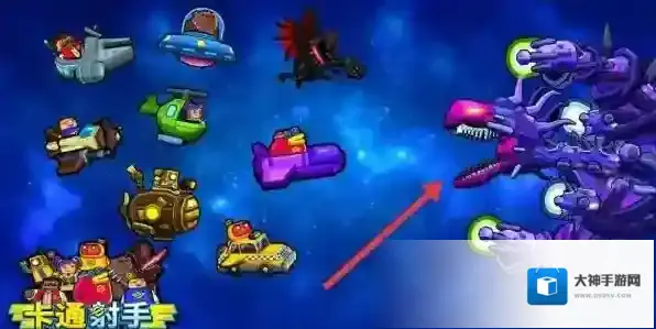 1、进入太空场景,面对紫色外星怪物,操控角色选择合适的载具,利用武器向怪物攻击,注意躲避敌方火力。