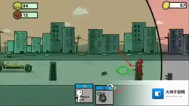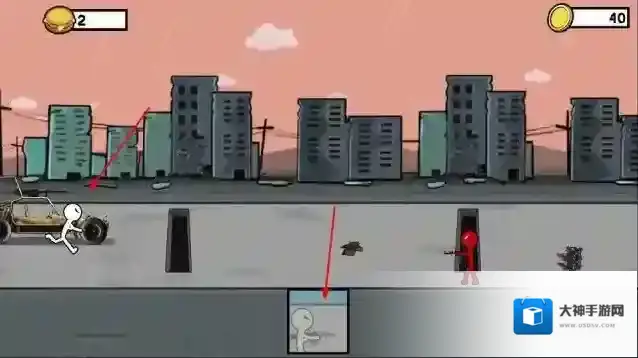 1、“操控移动”,控制白色火柴人,在城市废墟场景移动,躲避障碍(汽车、路障)。