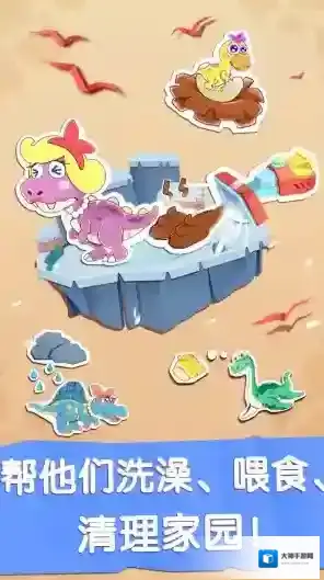 3、定期给恐龙喂食和洗澡保持快乐值。遇到大魔王来袭时,快速点击屏幕驱赶,保护恐龙不被偷走。