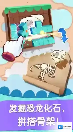 1、基础操作指引,点击使用考古工具挖掘化石,拖动手指清理化石表面,按照提示拼装恐龙骨架。