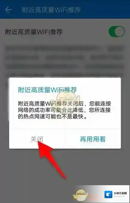 6、中间弹出一个选择框,找到“关闭”这个选项,点击它即可关闭附近高质量WIFI推荐。