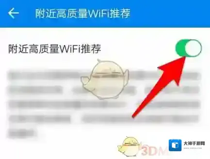 5、进入到“附近高质量WIFI推荐”界面后,用手点击箭头指向处的绿色开关;