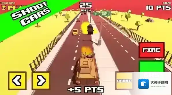 2、在公路场景操控坦克,利用左右箭头按钮转向,“GAS”键加速、“BRAKE”键减速,“FIRE”键射击,需在限时(00:35)内摧毁指定数量车辆(0/5)。