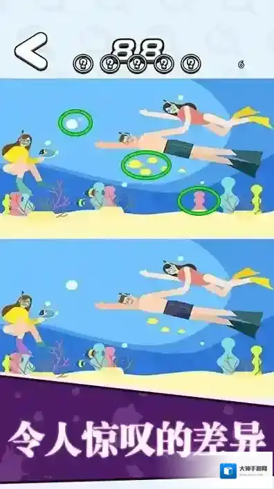 1、操作方式简单直观,点击标记差异位置,双指缩放查看细节,滑动切换对比区域。误点惩罚机制防止盲目猜测,培养真正观察力。