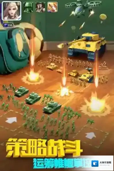 2、战斗界面,利用策略指挥部队(如士兵、坦克),按箭头方向推进,掌控战局,获取胜利。