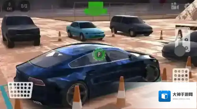 2、驾驶车辆(如金色、紫色赛车),按任务要求行驶,借虚拟按键控方向、速度,利用镜头旋转观察环境。